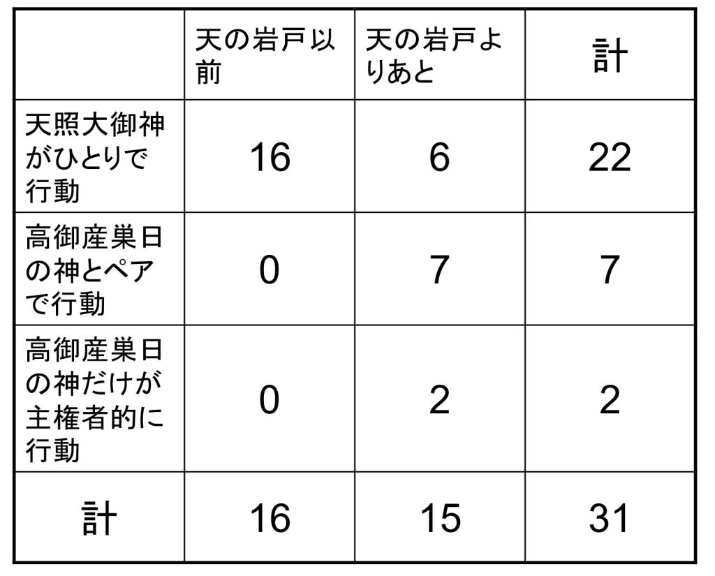 ②天照大御神が天の岩戸に入った後では、高御産巣日の神がよく出てくる。台与の代に変わってから、台与はまだ小さかったので、父親の高御産巣日の神の発言が増えることを表している。