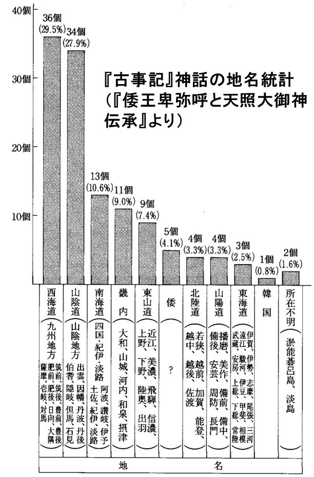 ①神話の地名は九州地方、出雲地方が圧倒的に多いことが分かる。『古事記』の神話の主要なモチーフは高天原の出来事と出雲の国譲りとなっている。このことは、大和朝廷の発祥とこの地方とに、何らかの関係があったと考えさせられる。(右のグラフ参照)