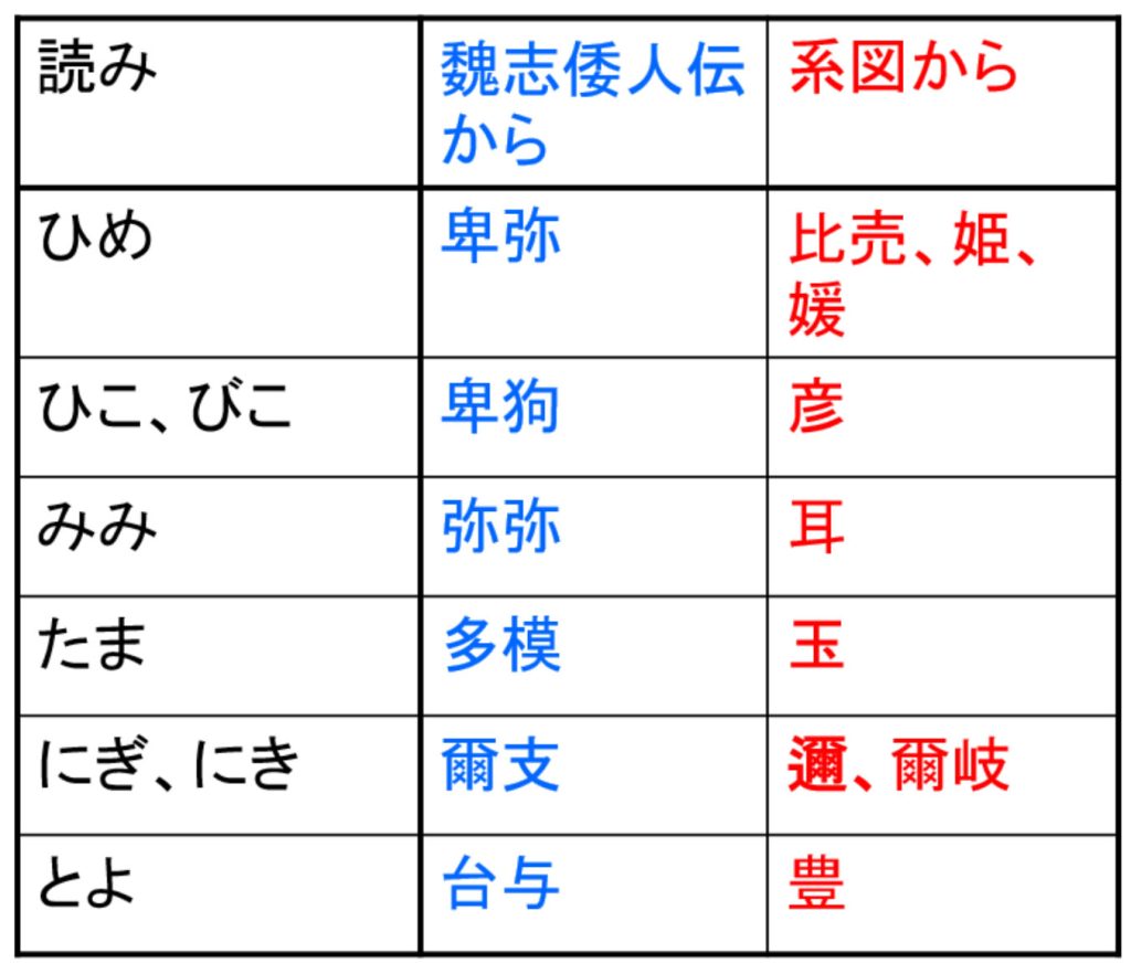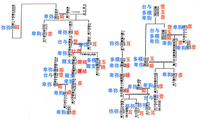 ・『魏志倭人伝』に、倭の国の「官名」として、「弥(み)(甲)弥(み)(甲)」が記されている。系図をみると、「ミ(甲)ミ(甲)」という音をふくむ神名として、「忍穂耳(おしほみみ)の尊(みこと)」「八箇耳(やつみみ)」「溝橛耳(みぞくひみみ)の神(かみ)」「手研耳(たぎしみみ)の命(みこと)」「神八井耳(かむやいみみ)の命(みこと)」「神渟名川耳(かむぬなかはみみ)の尊(みこと)」などがある。