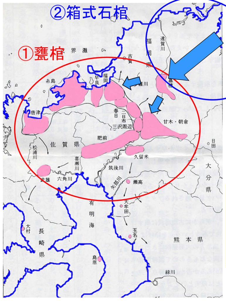 ・甕棺の分布は福岡県、佐賀県に多く分布している。弥生時代中期から後期に発展するが、後期中頃から急速に減少する。