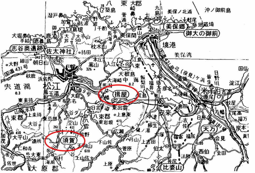 須賀、揖屋の位置(『邪馬台国と出雲神話』安本美典著、勉誠出版刊より)