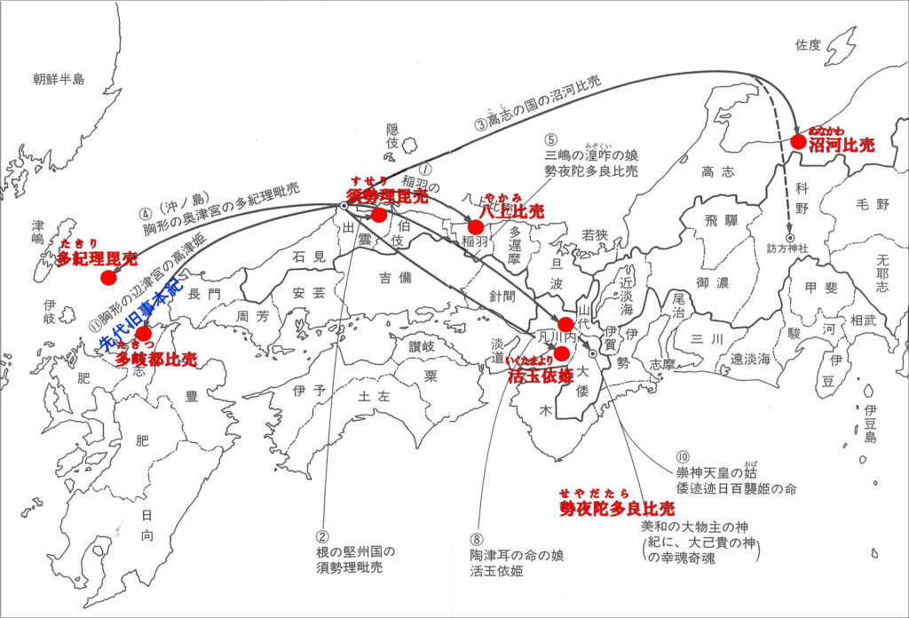 大国主の命はいろいろな土地の豪族の娘と結婚し、戦争をせずに自分の勢力範囲を拡大したようにみえる。主な婚姻関係は下記。