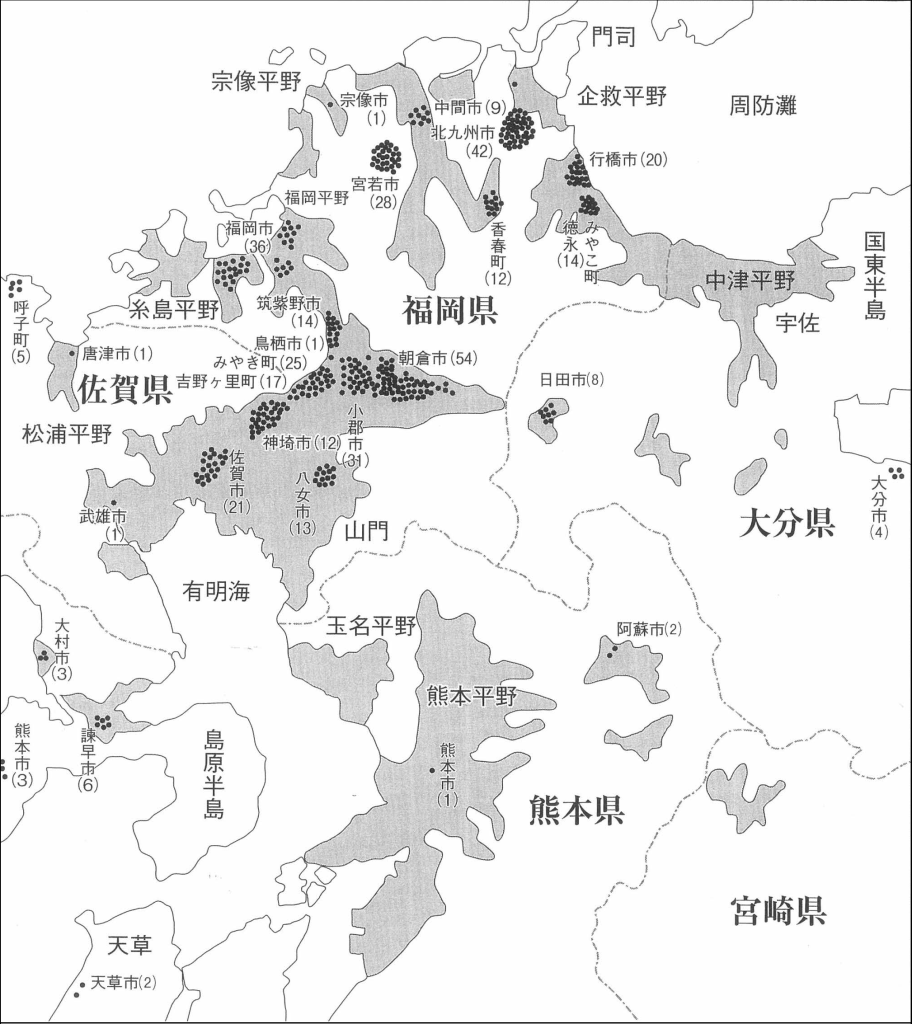 ・この本によると、箱式石棺に関し、都道府県別では福岡県が多く、市・町別では朝倉市が一番多く、次は北九州市である。これは人口の分布と一致している。