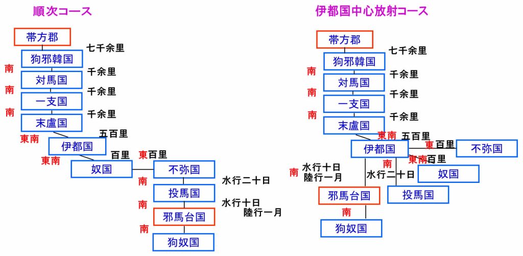 ・朝鮮から伊都国までは「A国、又・・・至B国」のように国が連続して繋がっているように書いてあるのに対して、以降は、「伊都国・・・・東南至奴国・・・・東行至不弥国・・・・南至投馬国・・・・南至邪馬台国」のように書かれており、伊都国を起点として放射状に国々が配置されている(放射式)と解釈するべきである。