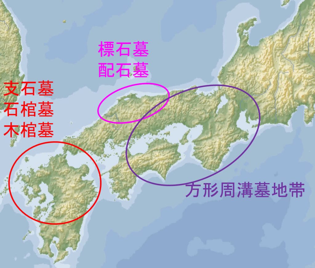 ・九州では区画を重視しない木棺墓や石棺墓で、瀬戸内では埋葬施設を方形や円形の溝で区画する周溝墓が出現。
