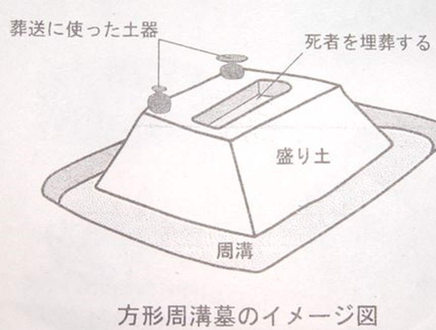 ・土壙(どこう)墓から墳丘墓に変化していったものとして、方形周溝墓が考えられ、溝を円形にした円形周溝墓も存在する。