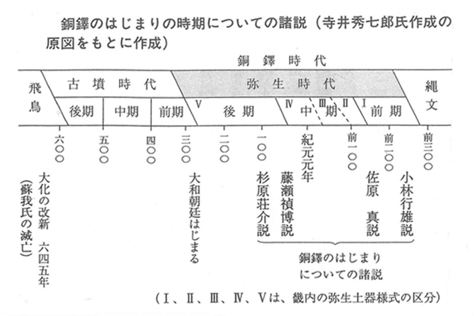 ・その結果、銅鐸のはじまりの時期についての諸説があり、小林行雄氏や佐原眞氏は古い時代にしているが、藤瀬禎博(よしひろ)氏、杉原壮介(そうすけ)氏は新しい時代にしており、そこには300年の隔たりがある。