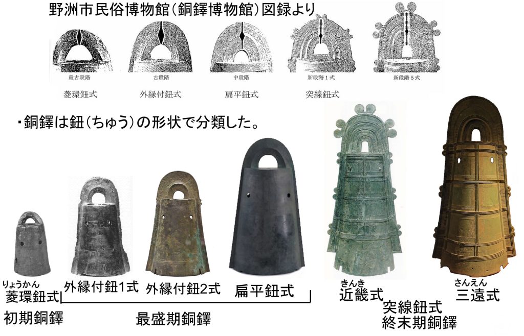 ・銅鐸の種類は、初期銅鐸(菱環鈕式)、最盛期銅鐸(外縁付鈕式、扁平鈕式)、終末期銅鐸[扁平鈕式(近畿式、三遠式)]がある。終末期銅鐸は、畿内、中部に多く分布する。