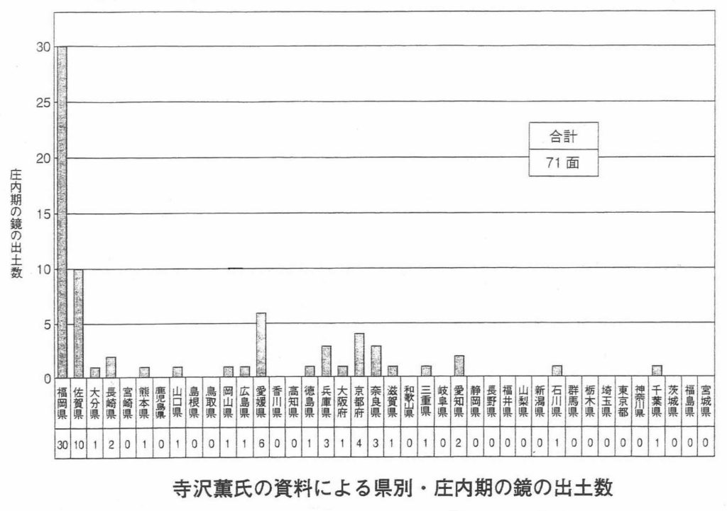 ・ 『魏志倭人伝』で、魏は倭に「銅鏡百枚」を与えたとある。そして、庄内期の銅鏡の出土は北九州が圧倒的に多い。更に、三角縁神獣鏡は古墳時代の4世紀以後の墳墓からしか出土していない。