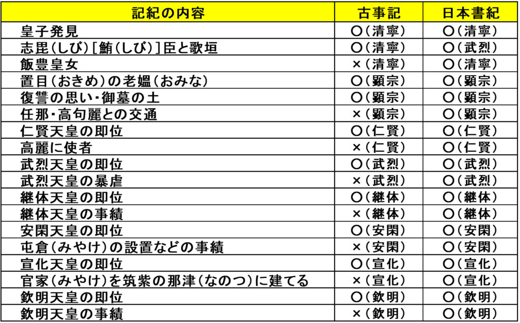 ・継体天皇について、『古事記』の事績記事は少ないが、『日本書紀』の事績記事は「継体天皇が擁立された話」「任那(みまな)四県の割譲」「己汶(こみん)・帯沙(たさ)をめぐるあらそい」「磐井の乱」「近江毛野(おうみのけなのおみ)の安羅(あら)への派遣」などと多い。