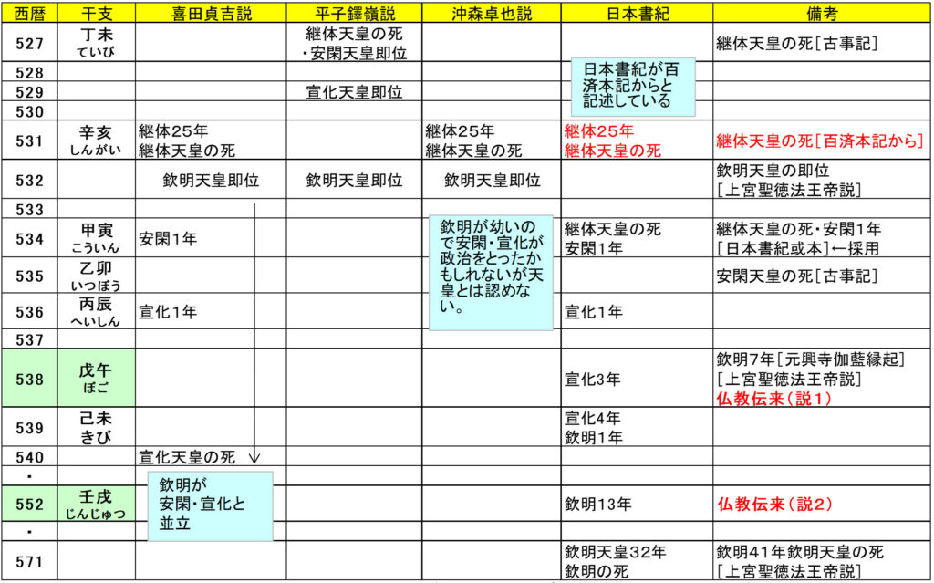 ・仏教公伝は『日本書紀』による552年説と『上宮聖徳法王帝説』及び『元興寺伽藍縁起』による538年(記載からは欽明7年とあるが『日本書紀』では宣化3年にあたる)説がある。