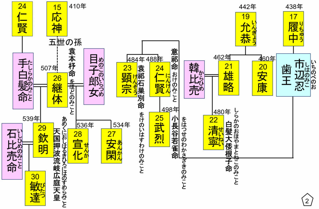 ・継体天皇は応神天皇から5世の孫だったので、安閑・宣化天皇は更に血筋が薄くなることになる。