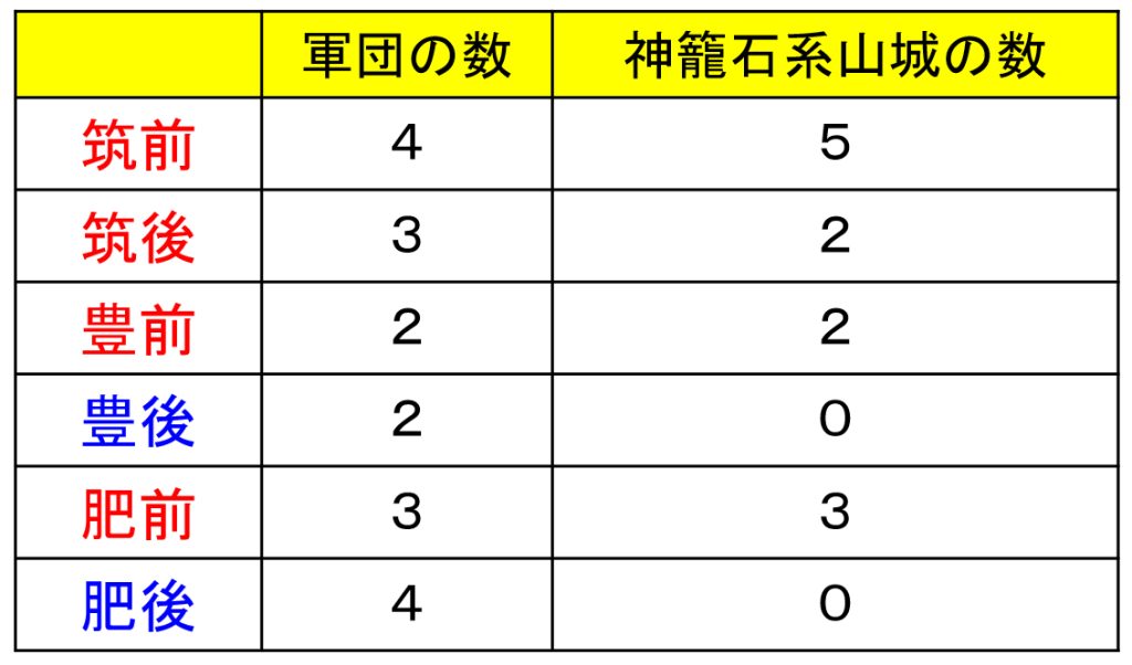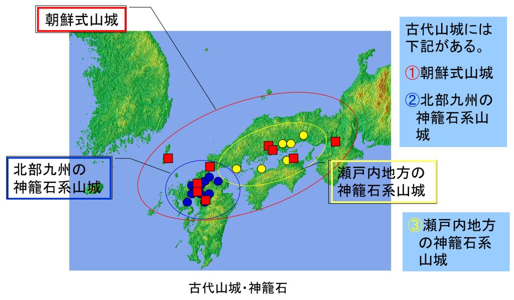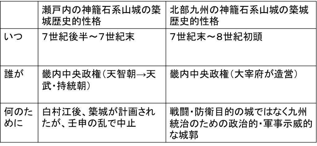 ・北部九州の神籠石系山城は7世紀末~8世紀初頭に畿内中央政権(大宰府が造営)が戦闘・防衛目的の城ではなく九州統治のための政治的・軍事示威的な城郭として構築。