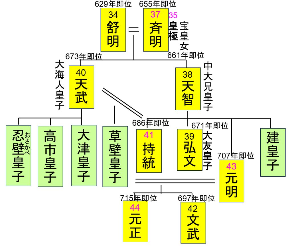 ・ 668年(天智7年):天智天皇は長らく皇子の立場で政治を行っていたが、即位して天皇となり、皇太子を大海皇子とした。