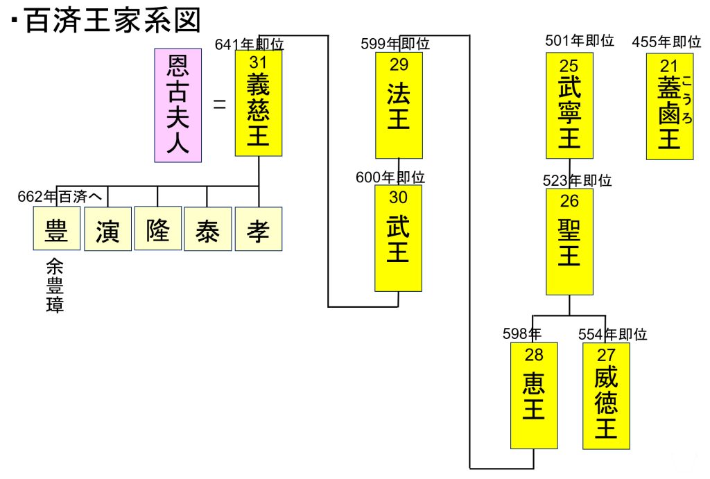 ・660年(斉明6年):唐・新羅によって百済王室は滅んだが、百済旧領で鬼室福信(王族ではないが有力貴族)が唐軍に抵抗し百済復興運動の指導者となった。