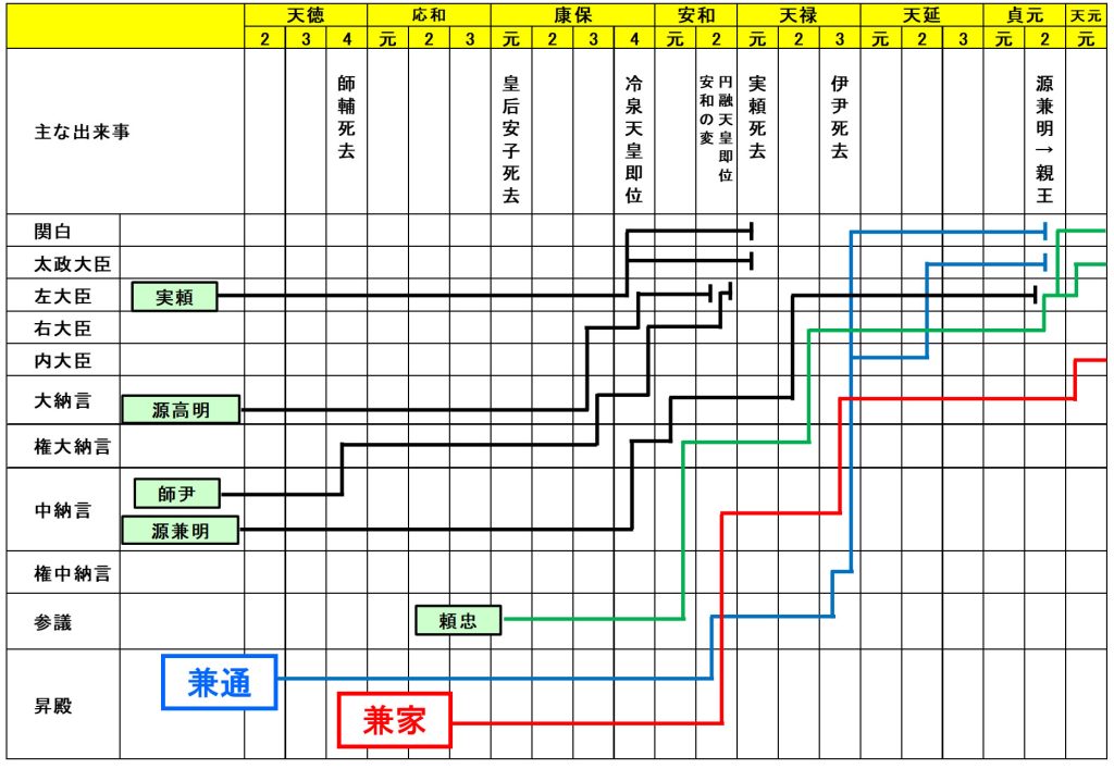 ・969年(安和2年)と次の年の2年間に、政界の上層部を占めていた実頼(摂政)、源高明、師尹(左大臣)、在衡(ありひら)[師尹の後の左大臣]が亡くなった。