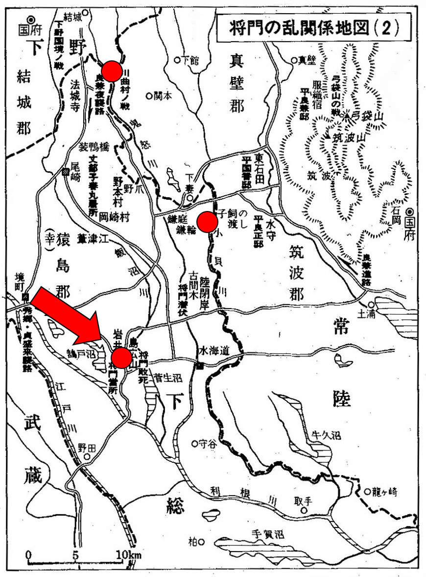 ・ 935年(承平5年)2月、将門は平真樹(まき)に誘われ、前常陸大掾の源護(まもる)一家と伯父の国香(くにか)を相手に、筑波・真壁・新治(にいはり)の三郡で合戦をした。源護の三人の子と国香が死ぬ。