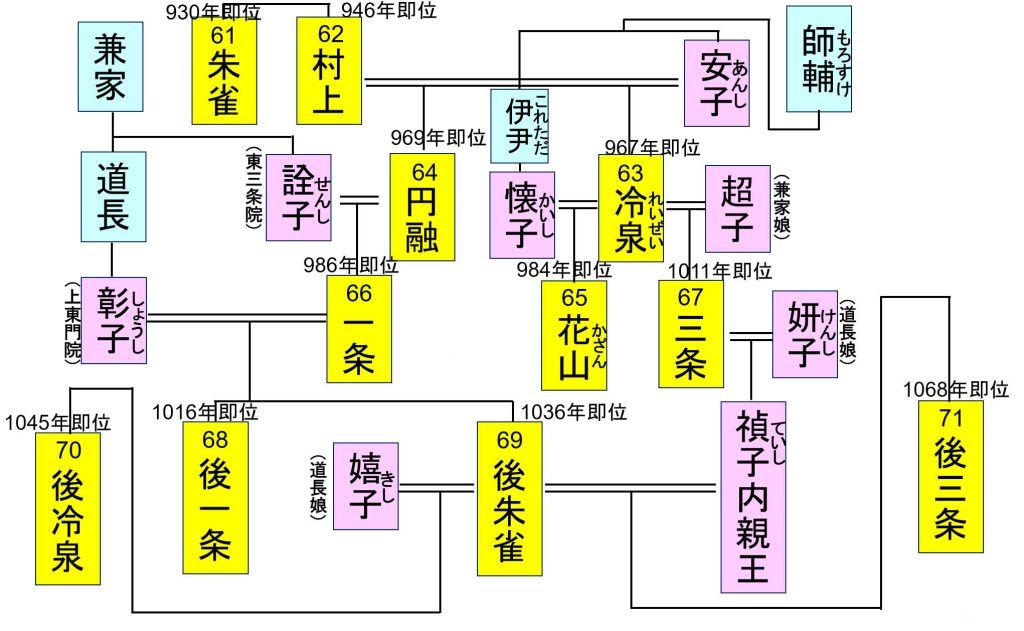 ・冷泉天皇が2年で譲位したのは狂気だったこともあるが、兼家の娘超子が冷泉天皇のもとに入内したこともあり、伊尹(これただ)の娘の懐子が皇子師貞親王を産んだので、伊尹は師貞親王を立太子させて安全を図ろうとしたと思われる。